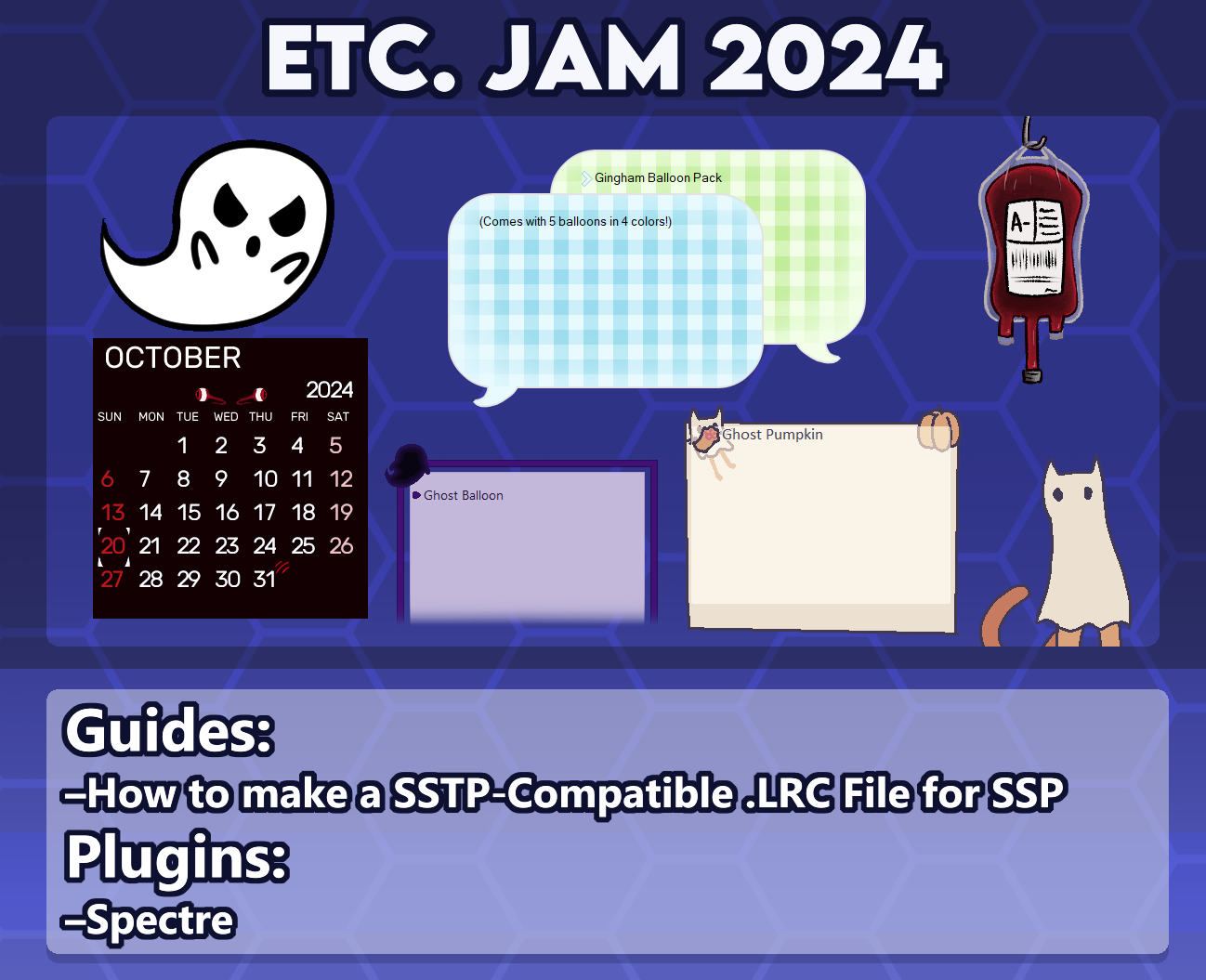 Etc. Jam is an event hosted by the Ukagaka Dream Team, where developers create something new besides a ghost. Balloons, calendar skins, plugins, etc.! Goals for the event include encouraging those interested in ukagaka development to give it a try with an easier project, and pushing developers to grow their skillsets and learn more by creating things they've never tried before.