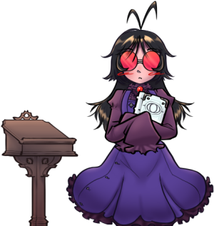 Bookworm & Lectern is a freeshell by WhatAPhantasia, depicting a girl with holding a book, and a lectern prop as a kero. The girl has various dressup options, including an option to remove her glasses, revealing animated bug eyes underneath.